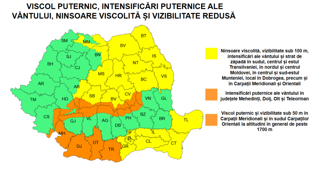 ANM a prelungit avertizările pentru perioada 08 ianuarie, ora 10:00 – 10 ianuarie, ora 10:00, semnalând ninsori, depuneri de zăpadă, polei, intensificări ale vântului și ger. Se anunță depuneri regionale de 3–10 cm, pe arii restrânse 5–15 cm, vizibilitate sub 100 m sau sub 50 m la altitudini mari.